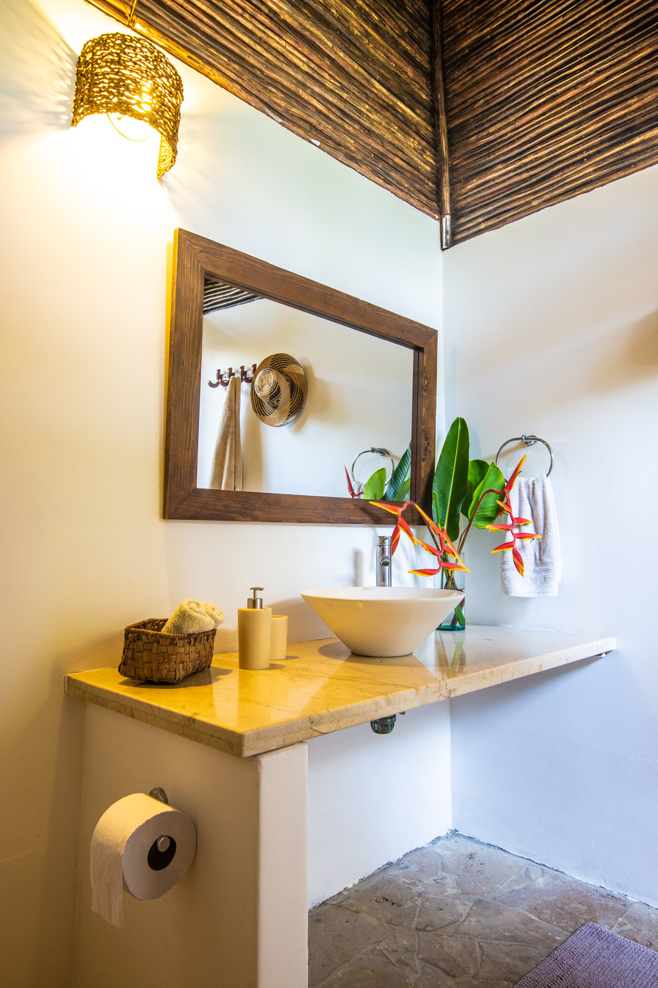 The Bungalow Sierra is our largest and most stunning room. The carefully curated design is inspired by the mystical Sierra Nevada mountains with her snow capped peaks, and the sacred geometry found in the triangular patterns in nature as well as our local indigenous cultures. Featuring breathtaking beach and ocean views and at over 80 square meters (800 sqft), this bungalow boasts an open floor plan with 1 King Bed (can also be set up with two single beds) and 2 separate single beds. Sleeps 2-4 people. This Cathedral Style structure is made with natural and native guadua (bamboo), hardwood and clay from the lower region of Sierra Nevada Mountains. The large and unique bathroom has 2 sinks and a shell inspired shower with hot water.